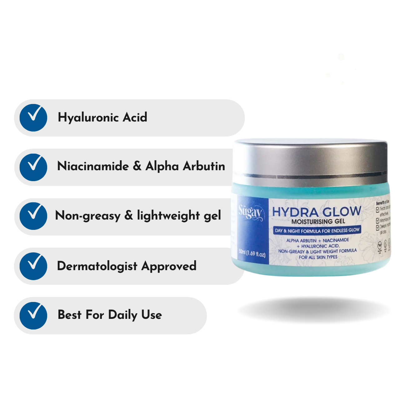 2. Hydrate: After cleansing, apply the Sugav® Hydra Glow Moisturizer Gel. Packed with Hyaluronic Acid, Niacinamide, and Alpha Arbutin, it restores hydration, boosts glow, and balances your skin barrier.