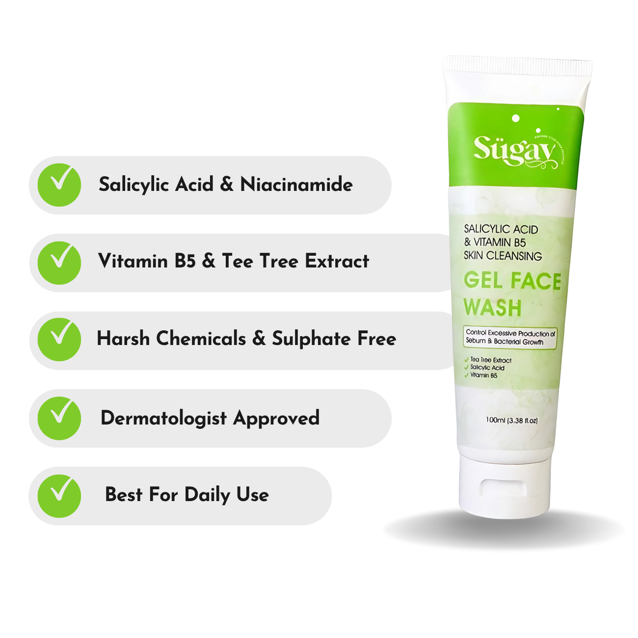 1. Cleanse: Begin your routine with the Sugav® Salicylic Acid Gel Face Wash. It deeply cleanses pores, removes excess oil, and helps reduce acne, blackheads, and dullness without drying out your skin.